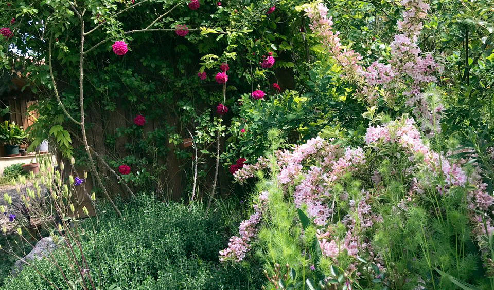 C’est un lieu intimiste, plein de charme, où les roses sont reines et partagent l’espace avec une grande diversité de vieux arbres, arbustes, graminées et vivaces.