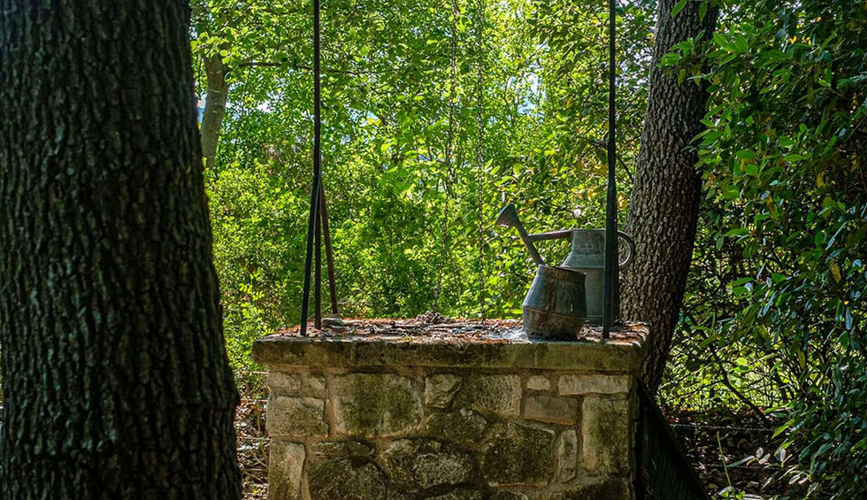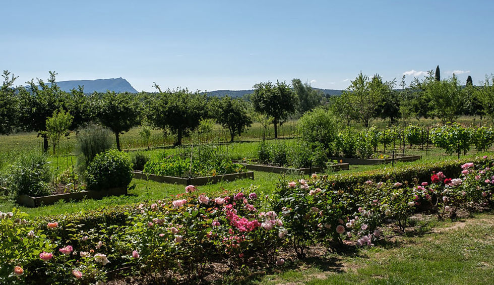 Une majestueuse Sainte Victoire, en toile de fond, qui s’incline en douceur au loin met en valeur une aire de battage, un parterre de buis, une chapelle, un labyrinthe et une tèse, le tout agrémenté de bassins, fontaines, d’un lavoir et de nombreux puits.